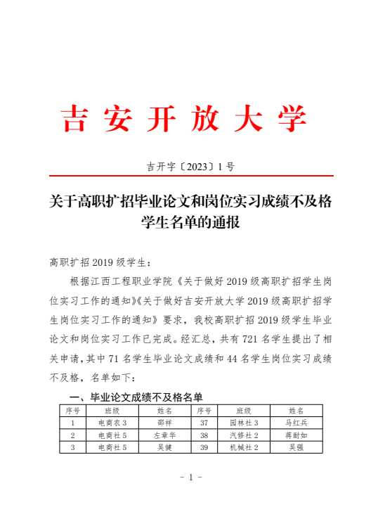 关于高职扩招毕业论文和岗位实习成绩不及格学生名单的通报 发布时间:2023-01-06 上一条:关于做好2022 年度江西开放大学开放教育优秀学员评选工作的通知 下一条:我校参加国开2022年秋季学期期末考试部署工作会 【关闭】