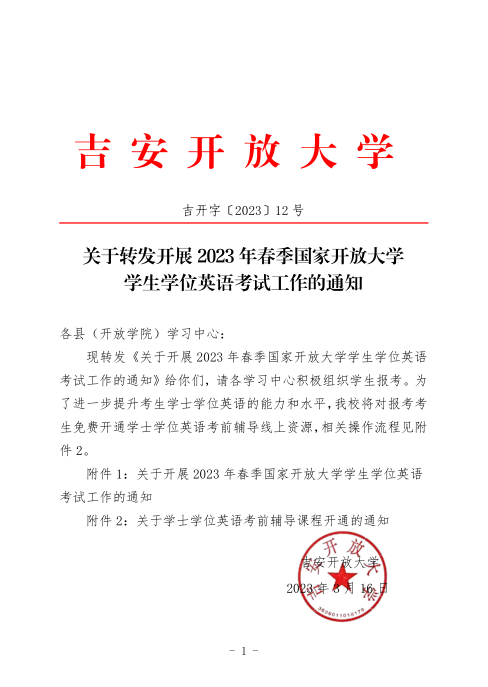 关于转发开展2023年春季国家开放大学学生学位英语考试工作的通知 发布时间:2023-03-20 附件下载:〔2023〕12号 附件1;关于开展 2023 年春季学期国家开放大学学士学位英语考试工作的通知.pdf 附件下载:〔2023〕12号 附件2 关于学士学位英语考前辅导课程开通通知.doc 上一条:关于转发《江西开放大学关于开展全省高等学历继续教育招生工作规范检查的通知》的通知 下一条:吉安开放大学关于“二元制”2023级新生缴费的通知 【关闭】