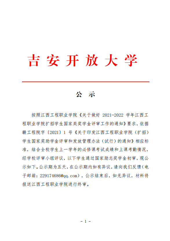 吉安开大高职扩招2022年9月国家励志奖学金初审结果的公示