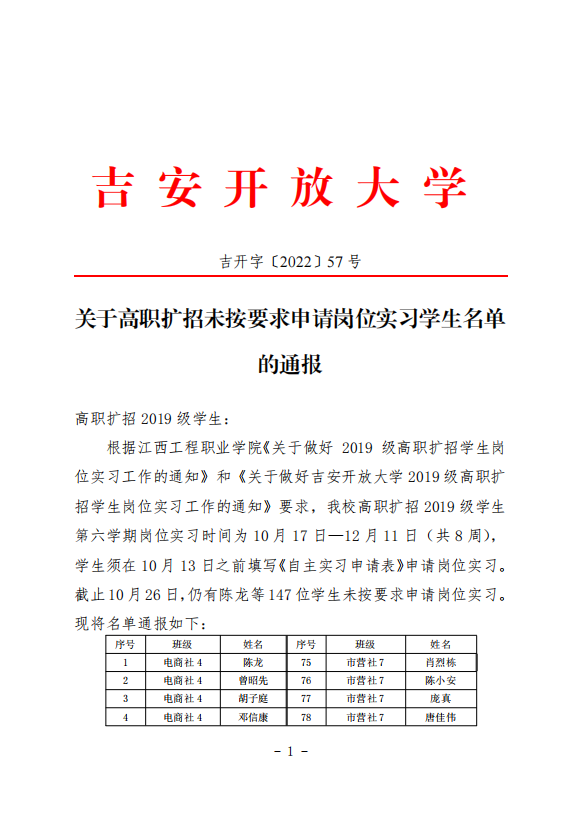 关于高职扩招未按要求申请岗位实习学生名单的通报