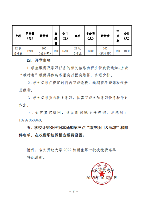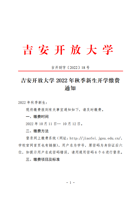 吉安开放大学 2022 年秋季新生开学缴费通知 发布时间:2022-10-31 附件下载:2022.18附件吉安开放大学 2022 秋新生第一批次缴费名单(1).xlsx 上一条:吉安开放大学 2022 年秋季(第二批次)新生开学缴费通知 下一条:关于高职扩招未按要求申请岗位实习学生名单的通报 【关闭】