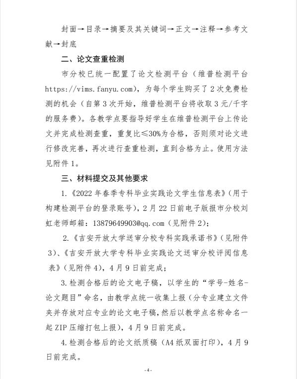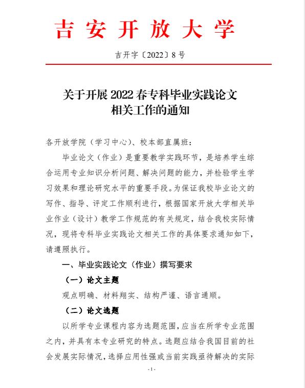 关于开展2022春专科毕业实践论文相关工作的通知 发布时间:2022-03-28 C:\fakepath\2022.08 附件(2).zip 附件下载:2022.08 附件(2).zip 附件下载:附件1 吉安开放大学维普论文检测使用手册.docx 附件下载:附件2 吉安开放大学2022春毕业实践论文学生信息表.xlsx 附件下载:附件3 吉安开放大学专科毕业实践论文教学点送审承诺书.docx 附件下载:附件4 吉安开放大学专科毕业实践论文送审分校评阅信息表.xls 附件下载:附件1 吉安开放大学维普论文检测使用手册.pdf 上一条:关于2022年春季学期国家开放大学学位英语考试报名的通知 下一条:关于开展 2021 年度国家开放大学奖学金评选工作的通知 【关闭】