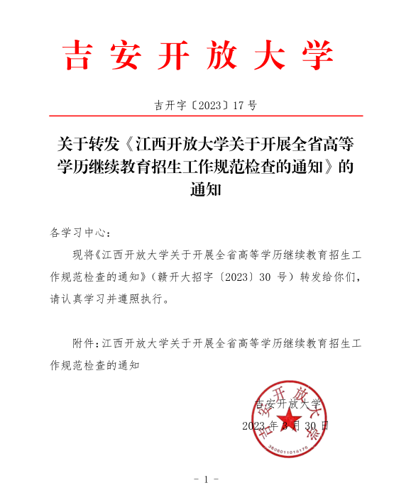关于转发《江西开放大学关于开展全省高等学历继续教育招生工作规范检查的通知》的通知 发布时间:2023-04-06 附件下载:吉开字〔2023〕17号 附件:江西开放大学关于开展全省高等学历继续教育招生工作规范检查的通知.pdf 上一条:关于转发《江西开放大学校保密办关于组织开展2023年保密宣传教育月活动的通知》的通知 下一条:关于转发开展2023年春季国家开放大学学生学位英语考试工作的通知 【关闭】