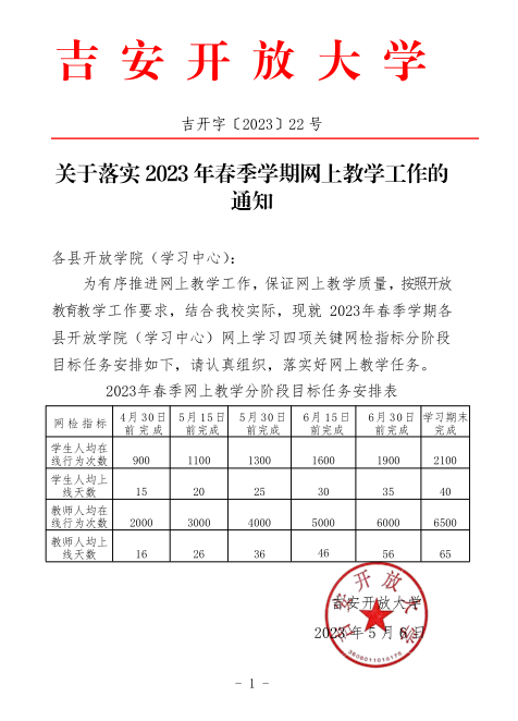 关于落实2023年春季学期网上教学工作的通知 发布时间:2023-05-08 上一条:我校参加国开2023年春季学期期末考试部署工作会 下一条:关于转发《江西开放大学校保密办关于组织开展2023年保密宣传教育月活动的通知》的通知 【关闭】