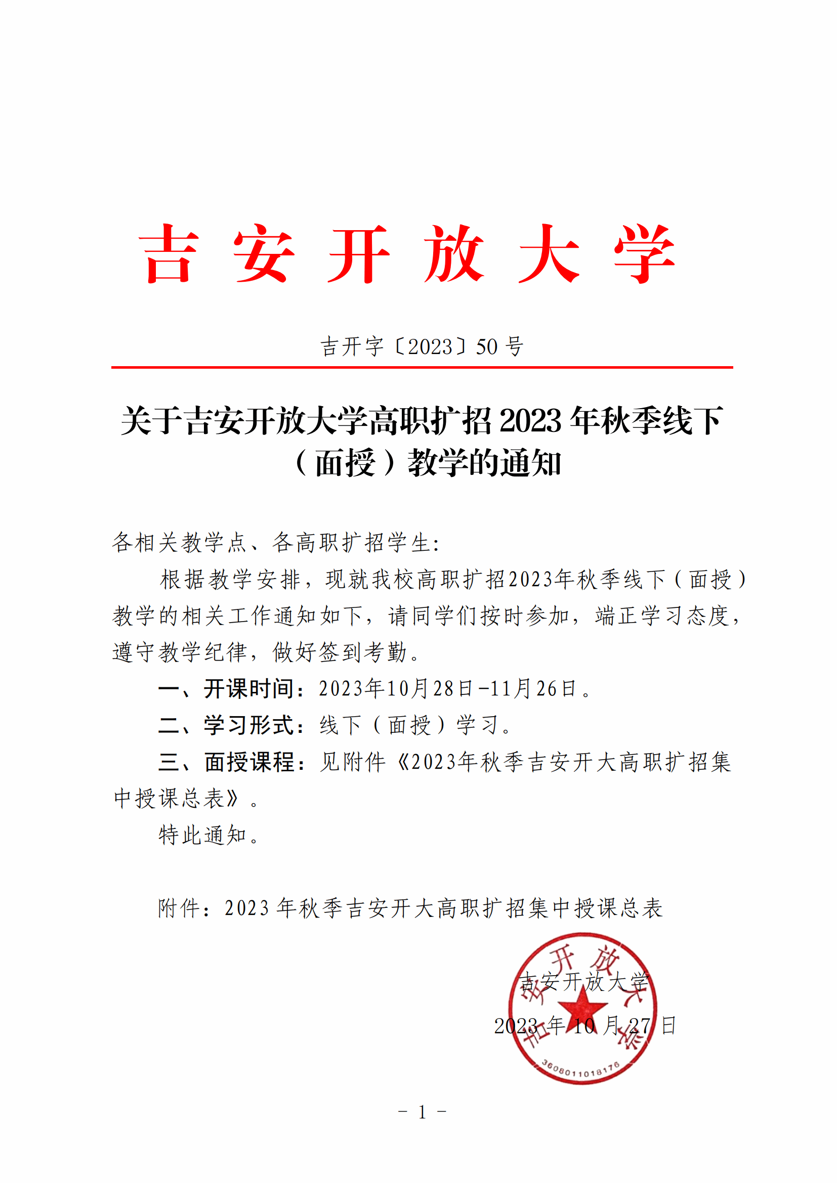 关于吉安开放大学高职扩招2023年秋季线下(面授)教学的通知 发布时间:2023-10-27 附件【吉开字〔2023〕50号附件:2023年秋季吉安开大高职扩招集中授课总表.xls】已下载次 上一条:关于吉安开放大学二元制2023年秋季线下(面授)教学的通知 下一条:关于2023年秋季学期面授(直播)教学安排的通知 【关闭】