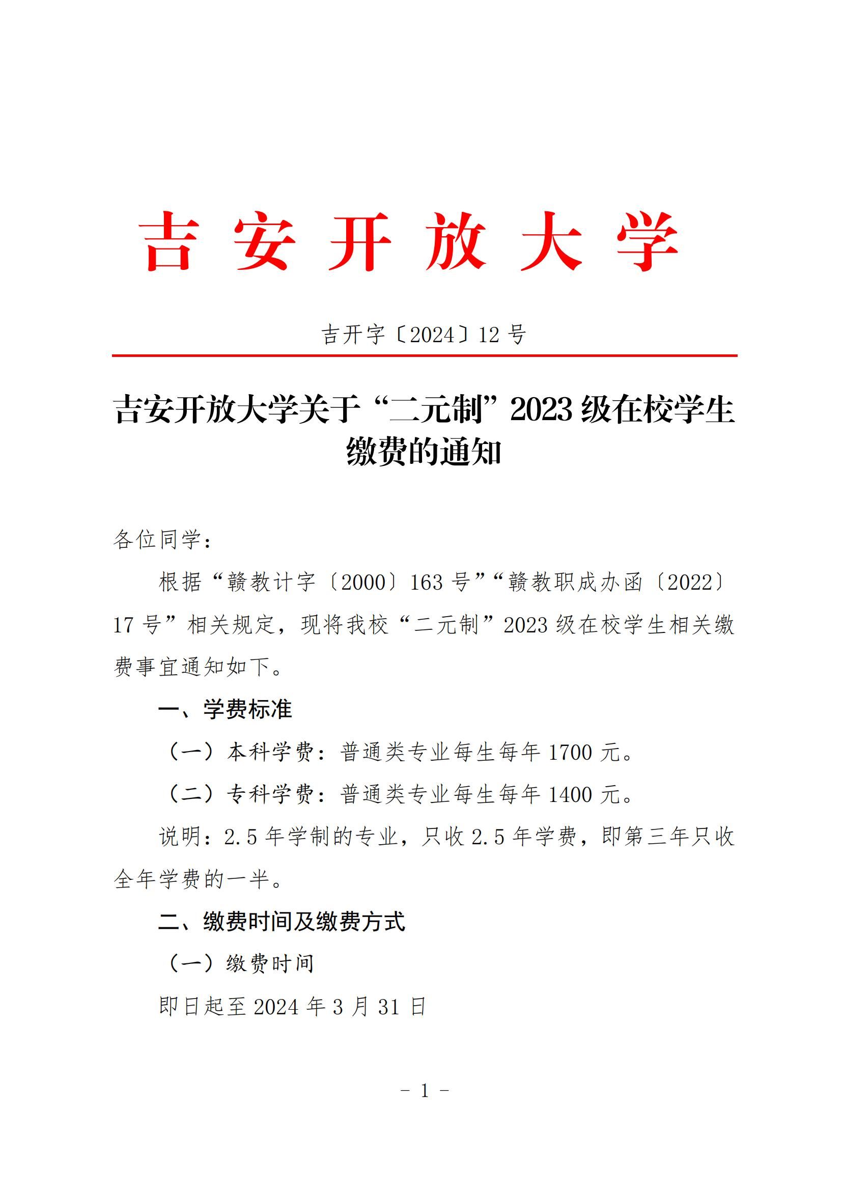 古安开放大学关于“二元制”2023级在校学生缴费的通知 发布时间:2024-03-15 上一条:关于吉安开放大学 2024 年春季第一阶段面授 直播教学的通知 下一条:关于发放2024年1月开放教育毕业生毕业证书工作的通知 【关闭】
