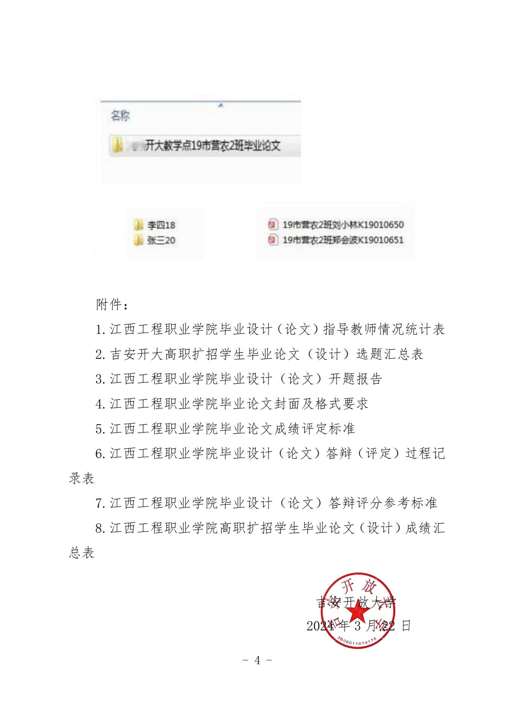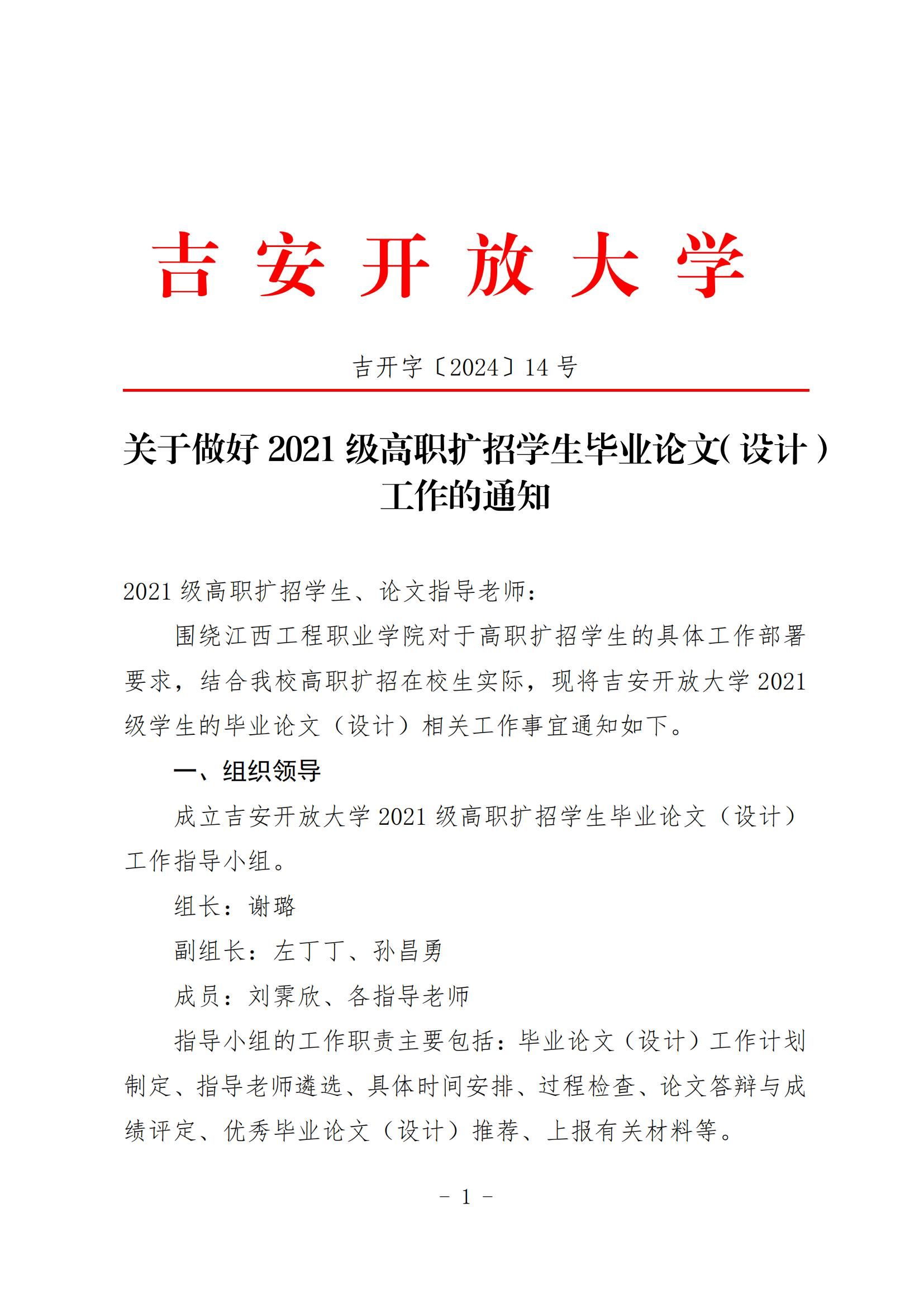 关于做好2021级高职扩招学生毕业论文(设计) 工作的通知 发布时间:2024-03-22 上一条:关于做好2021级高职扩招学生岗位实习工作的通知 下一条:关于吉安开放大学 2024 年春季第一阶段面授 直播教学的通知 【关闭】