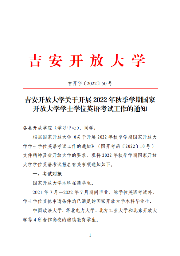 吉安开放大学关于开展2022年秋季学期国家开放大学学士学位英语考试工作的通知