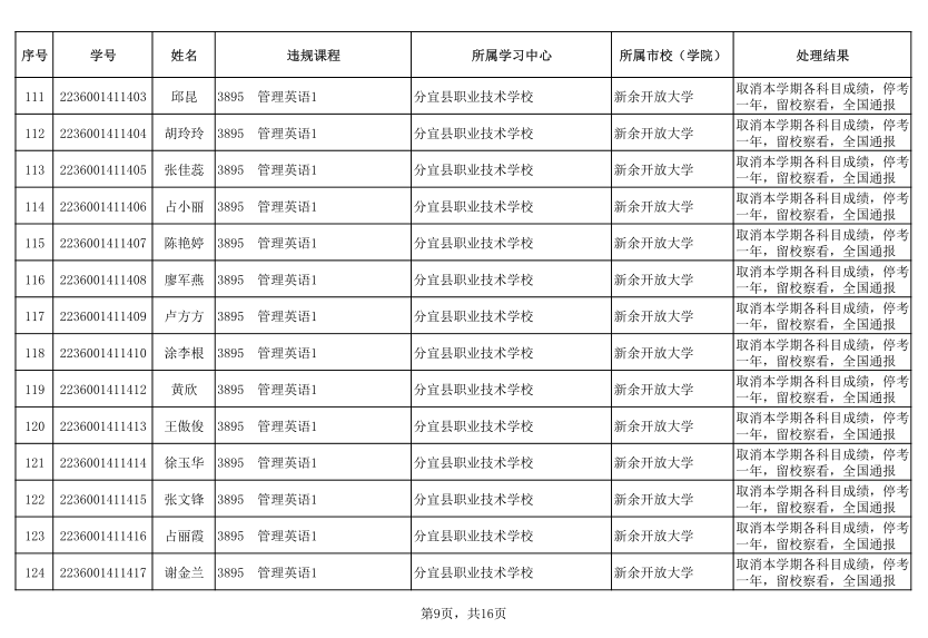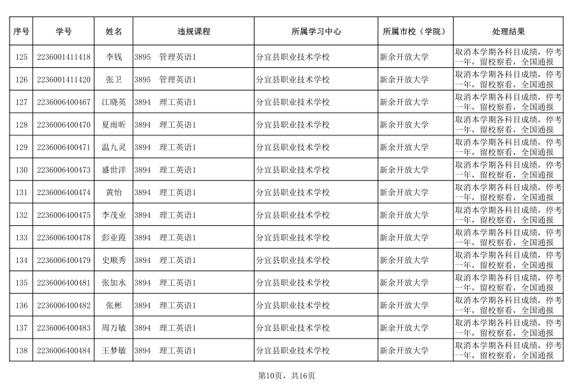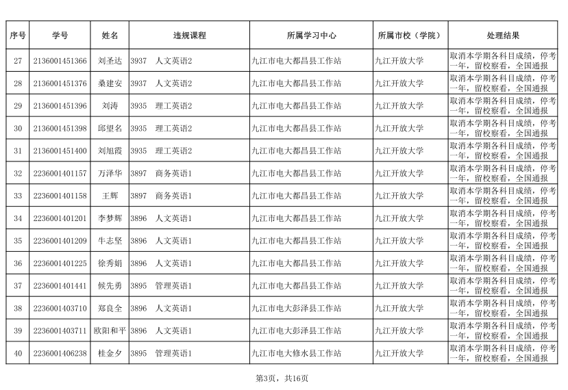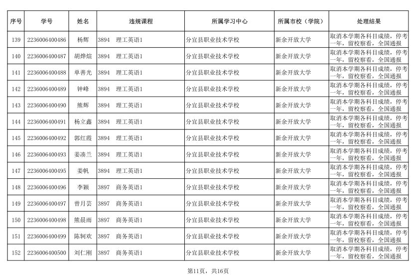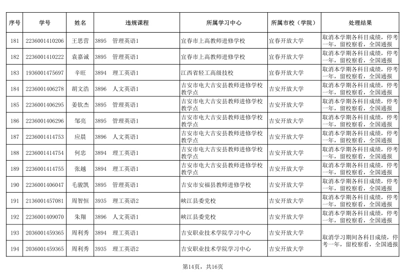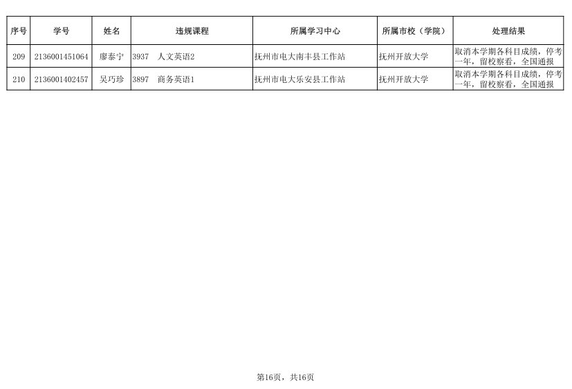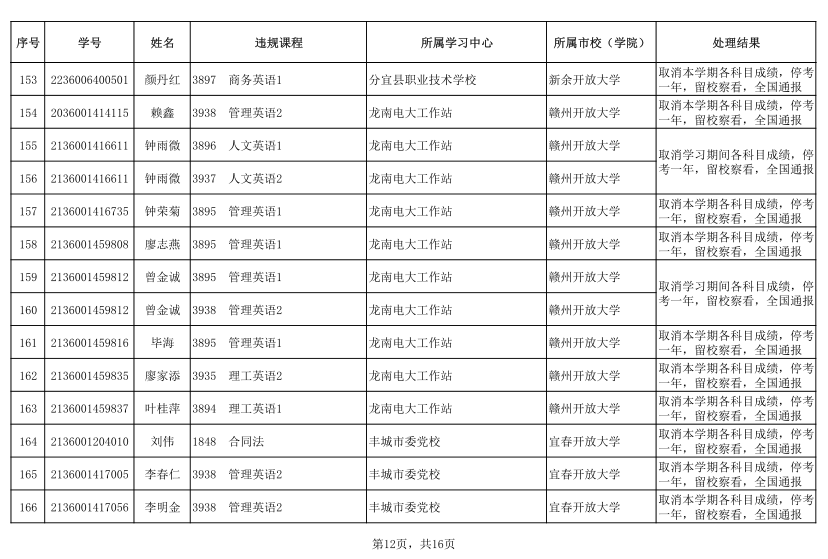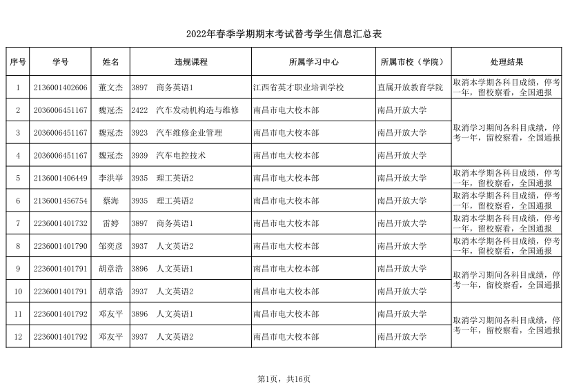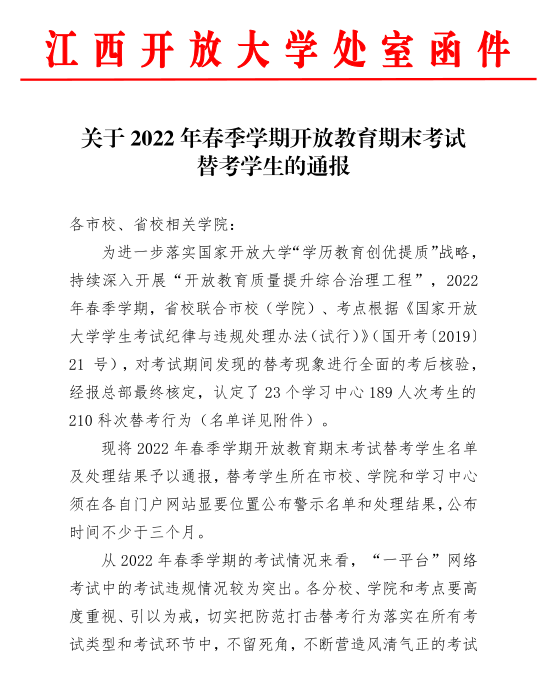 关于2022年春季学期开放教育期末考试替考学生通报 发布时间:2022-12-02 上一条:吉安开放大学顺利开展2022年秋季“一网一平台”期末考试工作 下一条:关于开展2022年综合教学检查工作的通知 【关闭】