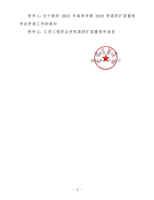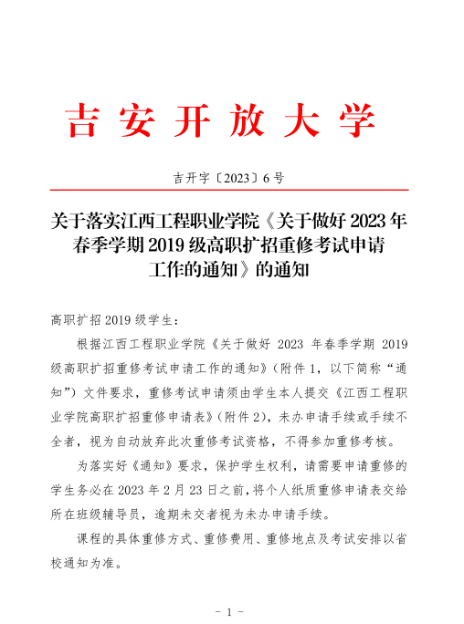 关于落实江西工程职业学院《关于做好2023年春季学期2019级高职扩招重修考试申请工作的通知》的通知 发布时间:2023-02-20 附件下载:附件1:关于做好2023年春季学期2019级高职扩招重修考试申请工作的通知.pdf 附件下载:附件2:江西工程职业学院高职扩招重修申请表.docx 上一条:吉安开放大学2023年春季校本部老生开学缴费通知 下一条:关于高职扩招2020级 2021级学生缴纳学费的通知 【关闭】