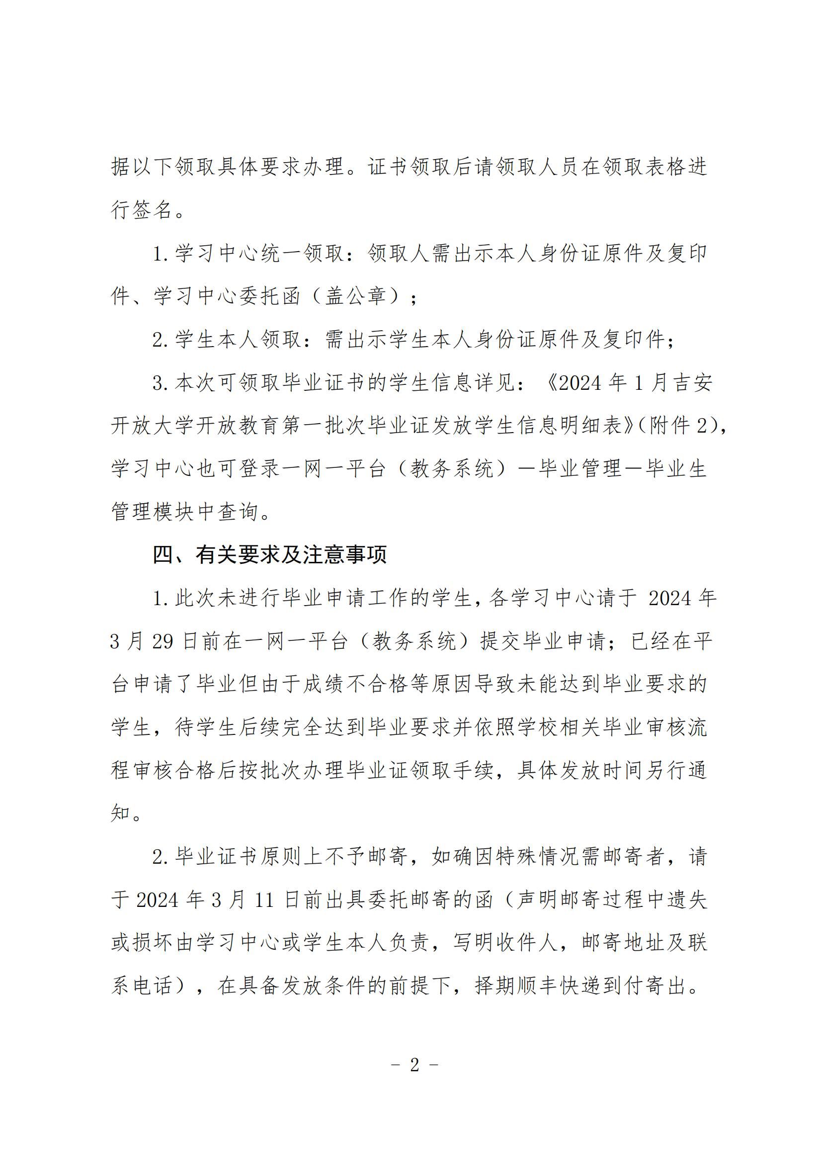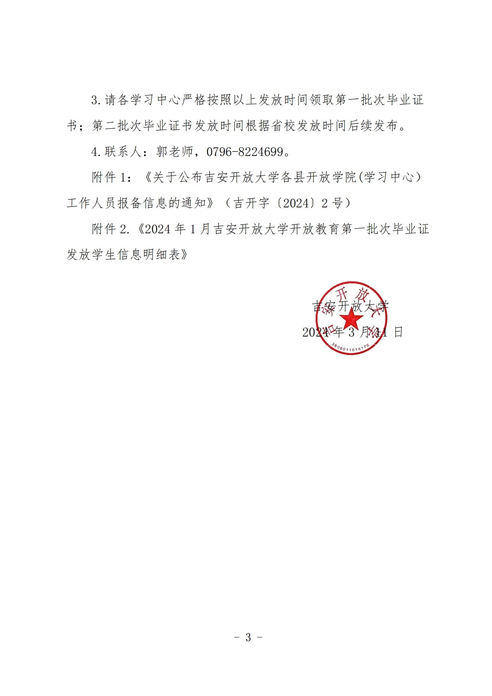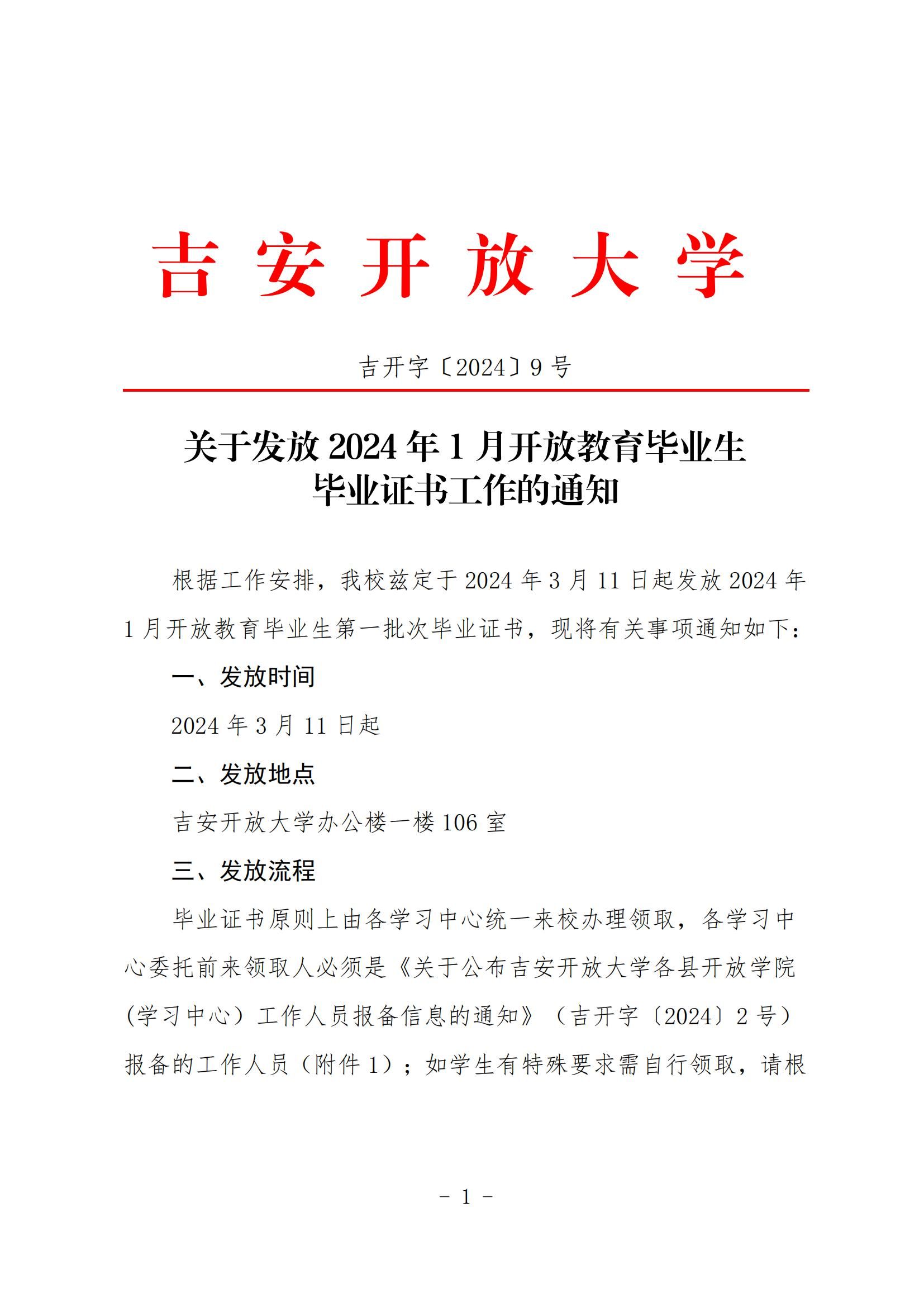 关于发放2024年1月开放教育毕业生毕业证书工作的通知 发布时间:2024-03-11 上一条:古安开放大学关于“二元制”2023级在校学生缴费的通知 下一条:吉安开放大学2024年春季校本部老生开学缴费通知 【关闭】