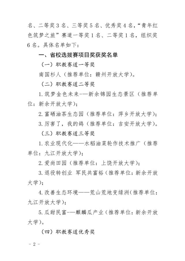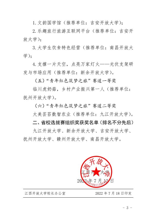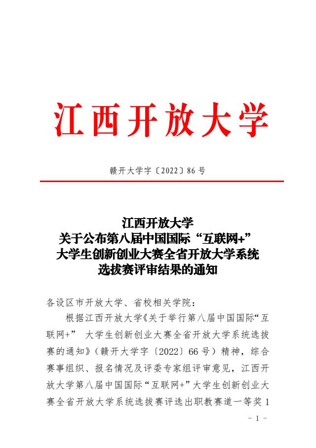 我校在第八届中国国际“ 互联网+”大学生创新创业大赛全省开放大学系统选拔赛中获佳绩 发布时间:2022-07-21 近日,江西开放大学公布第八届中国国际“互联网+”大学生创新创业大赛全省开放大学系统选拔赛评审结果,我校取得不错成绩。三个参赛项目中,《厉害了,我的鸽!》获二等奖,《文韵国学馆》和《乐趣旅行旅游互联网平台》获优秀奖。吉安开放大学获组织奖。 此次中国国际“互联网+”大学生创新创业大赛省校选拔赛采取线上方式进行,全省开放大学系统8个单位组织了15个项目团队参与比赛,比赛通过作品展示、现场答辩两个环节,充分展示团队风采。 上一条:吉安开放大学关于组织开展2022级开放教育新生开学典礼活动的通知 下一条:我校参加第八届中国国际“互联网+”大学生创新创业大赛全省开放大学系统选拔赛 【关闭】