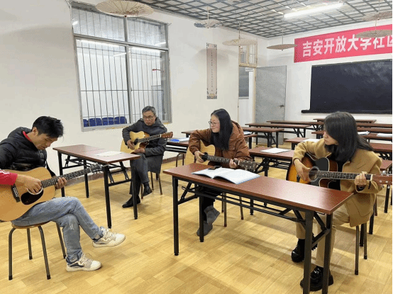 吉他班老师用脍炙人口的流行音乐与娴熟的弹唱技艺,调动起学员的学习兴趣,学员聚精会神地听讲,取得了不错的教学效果。
