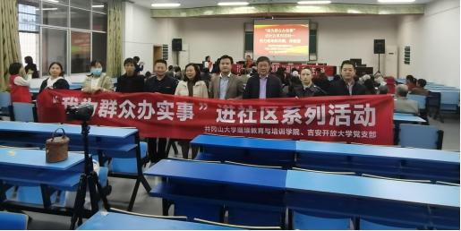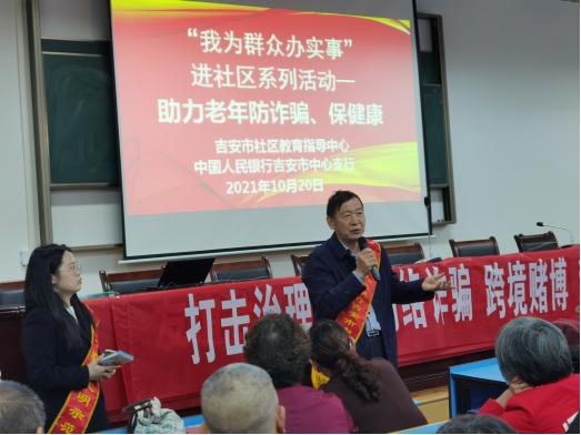 为扎实推进党史学习教育,引导广大党员坚定理想信念,加强党性锤炼,多办聚民心暖人心强信心筑同心的实事。10月20日下午,继续教育与培训学院(吉安开放大学)党支部以吉安市社区教育指导中心为平台,联合中国人民银行吉安市中心支行,为友谊社区居民和校离退休老干部开展了“携手进社区,助力老年防诈骗、保健康"主题活动。活动由党支部书记王志民同志主持。