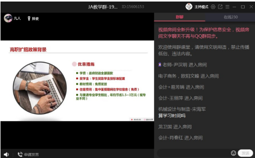 5月18日吉安电大正式开讲线上直播教学第一课 发布时间:2020-05-22 根据高职扩招疫情期间集中线上直播教学安排,5月18日,吉安电大正式开讲线上实时直播教学第一课《入学教育》。 经过前期紧张的准备和安排,5月18日晚上7时30分,《入学教育》教学团队贺晓斌、黄立明等任课老师准时通过QQ群课堂,与2019级高职扩招各专业新生在线上实时“见面”开讲。 吉安电大校长贺晓斌教授作为教学团队的一员,亲自承担了一个班的《入学教育》直播教学,他通过精心准备的PPT和视频、文件材料的展示,给同学们完整、清晰地解读了高职扩招的政策背景、学历优势、在校学习的形式及毕业生的未来发展等。他语言流畅、思路清晰、风趣生动的教学风格,吸引住了学生。 课堂的最后,任课老师还安排了互动答疑环节,老师们就学生们最关心的问题一一给予了清晰的回答。 各班直播上课前,辅导员在群里实施了学生在线限时签到,并进行教学引导,绝大部分同学能顺利参加到直播教学中,也有个别学生操作生疏,不能顺利进入课堂。 直播课程结束,约十多分钟后,QQ群课堂自动生成了课程回放,因各种原因未能在线听课的同学可以通过观看课程回放的方式进行补学习。 根据教学安排,吉安电大将在后面连续的数周中,利用晚上和周末业余时间依次完成线上直播教学和集中面授教学任务。(成教部) 上一条:吉安电大召开2020年高职扩招新生开学第五次工作会 下一条:吉安电大召开2020年高职扩招新生开学第六次工作会 【关闭】
