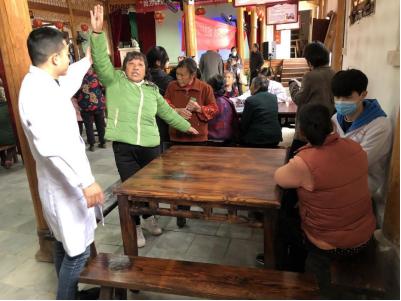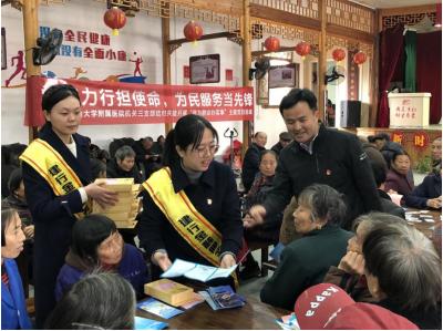附属医院工作人员为当地老年人提供量血压、康复按摩等义诊服务。医生给前来咨询的老年人们普及生活健康知识,认真解答了关于常见病的预防诊治问题。