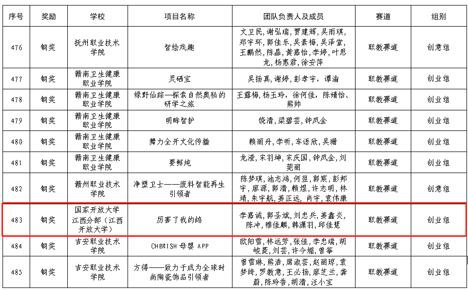 近日,由江西省教育厅、江西省发展和改革委员会等9个部门联合主办的“建行杯”江西省大学生创新大赛(2024)总决赛落下帷幕并公布了成绩,我校《厉害了,我的鸽》项目荣获职教赛道铜奖。