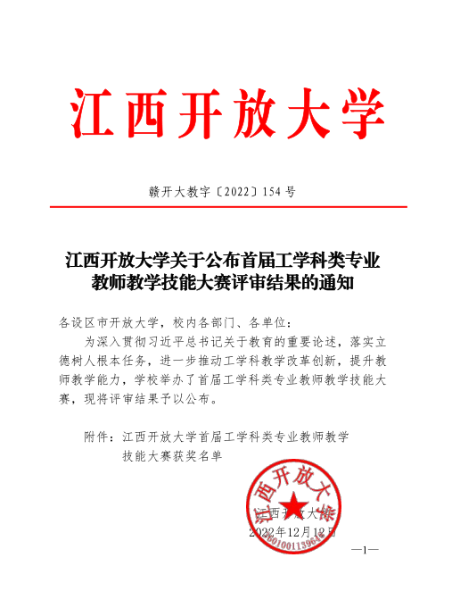 我校尹汉明老师荣获江西开放大学首届工学科类专业教师教学技能大赛三等奖 发布时间:2022-12-27 江西开放大学为深入贯彻习近平总书记关于教育的重要论述,落实立德树人根本任务,进一步推动工学科教学改革创新,提升教师教学能力,举办了首届工学科类专业教师教学技能大赛。 此次大赛经参赛教师个人申报、各市开大遴选、专家评审,最终评选出一等奖2名,二等奖5名,三等奖5名。我校尹汉明老师在此大赛中荣获三等奖。 附件:江西开放大学关于公布首届工学科类专业教师教学技能大赛评审结果的通知 (文:谢文平,审核:左丁丁、尹汉明) 上一条:我校王志民老师荣获江西开放大学思政课专职教师全员“晒课”大赛二等奖 下一条:我校胡忠光老师荣获国家开放大学教育类专业课程思政优秀教学设计方案比赛二等奖 【关闭】