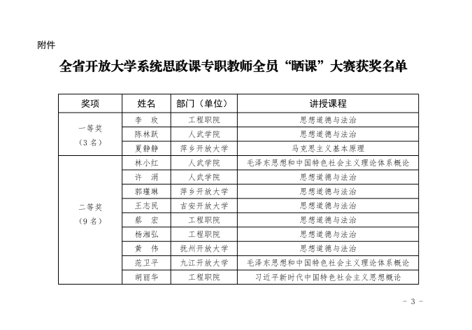 我校王志民老师荣获江西开放大学思政课专职教师全员“晒课”大赛二等奖 发布时间:2022-12-27 近日,我校王志民老师在江西开放大学思政课专职教师全员“晒课”大赛中荣获二等奖。 据悉,此次表彰是江西开放大学为全面检验全省开放大学系统思政课专职教师教学能力和水平,切实增强思政课思想性、理论性和亲和力、针对性,共收到全省开放大学系统思政课专职教师“晒课”作品27份,经专家评审,评选出一等奖3名,二等奖9名(二等奖后四名成绩并列),三等奖11名,优胜奖4名。 附件:江西开放大学关于公布全校思政课专职教师全员“晒课”大赛评审结果的通知 (文:谢文平,审核:左丁丁、尹汉明) 上一条:张泰城教授与井冈山精神博物馆 下一条:我校尹汉明老师荣获江西开放大学首届工学科类专业教师教学技能大赛三等奖 【关闭】