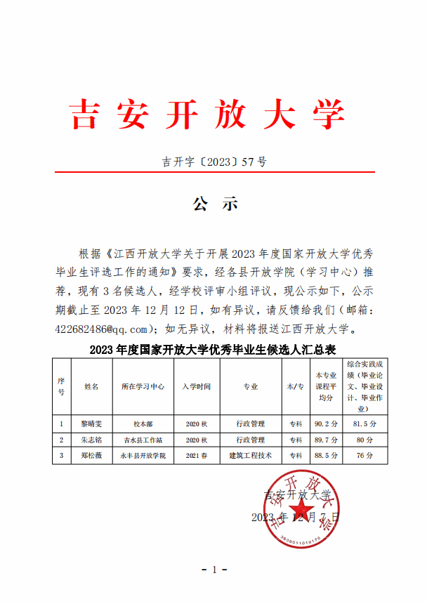 公示 发布时间:2023-12-07 上一条:吉安开放大学关于推荐2023年招生先进集体、优秀个人、贡献奖评审结果的公示 下一条:吉安开放大学关于推荐2022年招生先进集体和优秀个人评审结果的公示 【关闭】